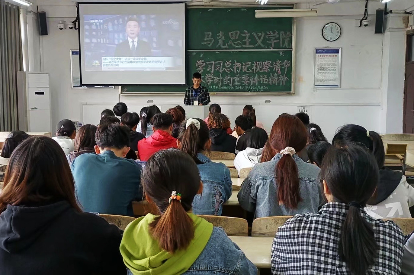 同学们观看了相关新闻报道,重点学习了习近平总书记在清华大学考察时的重要讲话精神,员工代表作了交流发言。