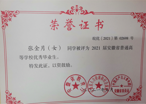 支部注重发挥典型带学,推介先进典型的优秀事迹,研究生支部副书记2018级研究生张金月获评安徽省优秀毕业生和校优秀共产党员,立足工作岗位,服务群众,在工作、学习和生活中带头发挥先锋模范作用,带头带领同学们学习党史,进一步激发了同学们的学习自觉和动力。