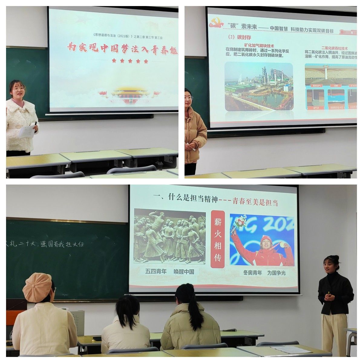 在参加安徽省江南片高校首届老员工讲思政课比赛活动基础之上,三位参赛同学围绕主题“喜迎二十大,强国有我担大任”、“为实现中国梦注入青春能量”和“共碳强国之路,共享绿色未来”依次进行了生动讲解和精彩展示。随后,在场的老师对每位参赛同学的试讲进行了细致全面的点评与指导,就教学目标、教学内容、教学设计、课件制作、教学仪态、教学方法等方面给出具体建议。
