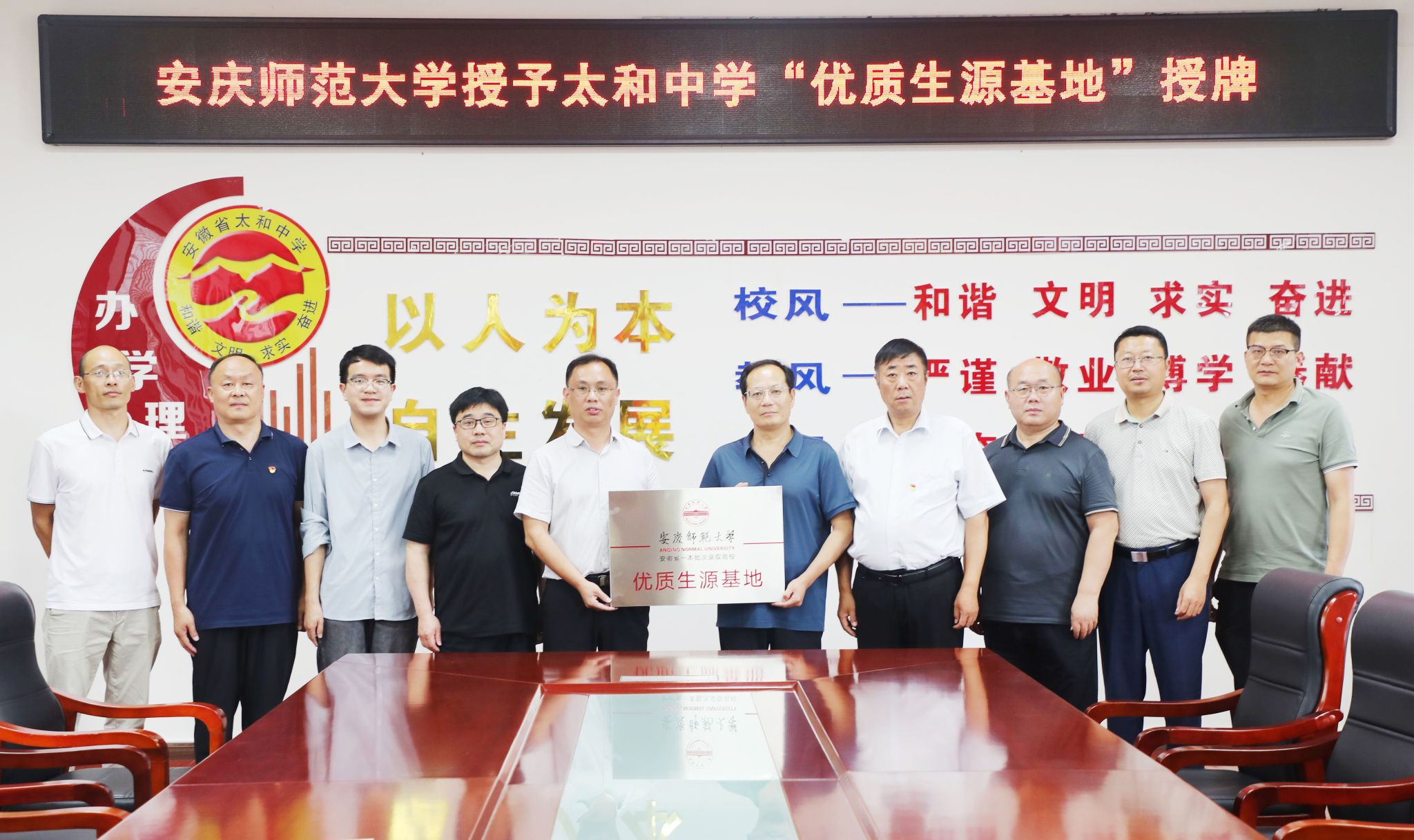 7月3日,公司副经理余江舟带领教务和实验实训中心负责人一行前往太和中学参加“优质生源基地”签约及授牌仪式。太和中学党总支书记王永先、副董事长王德民等公司党政领导班子成员参加授牌仪式。