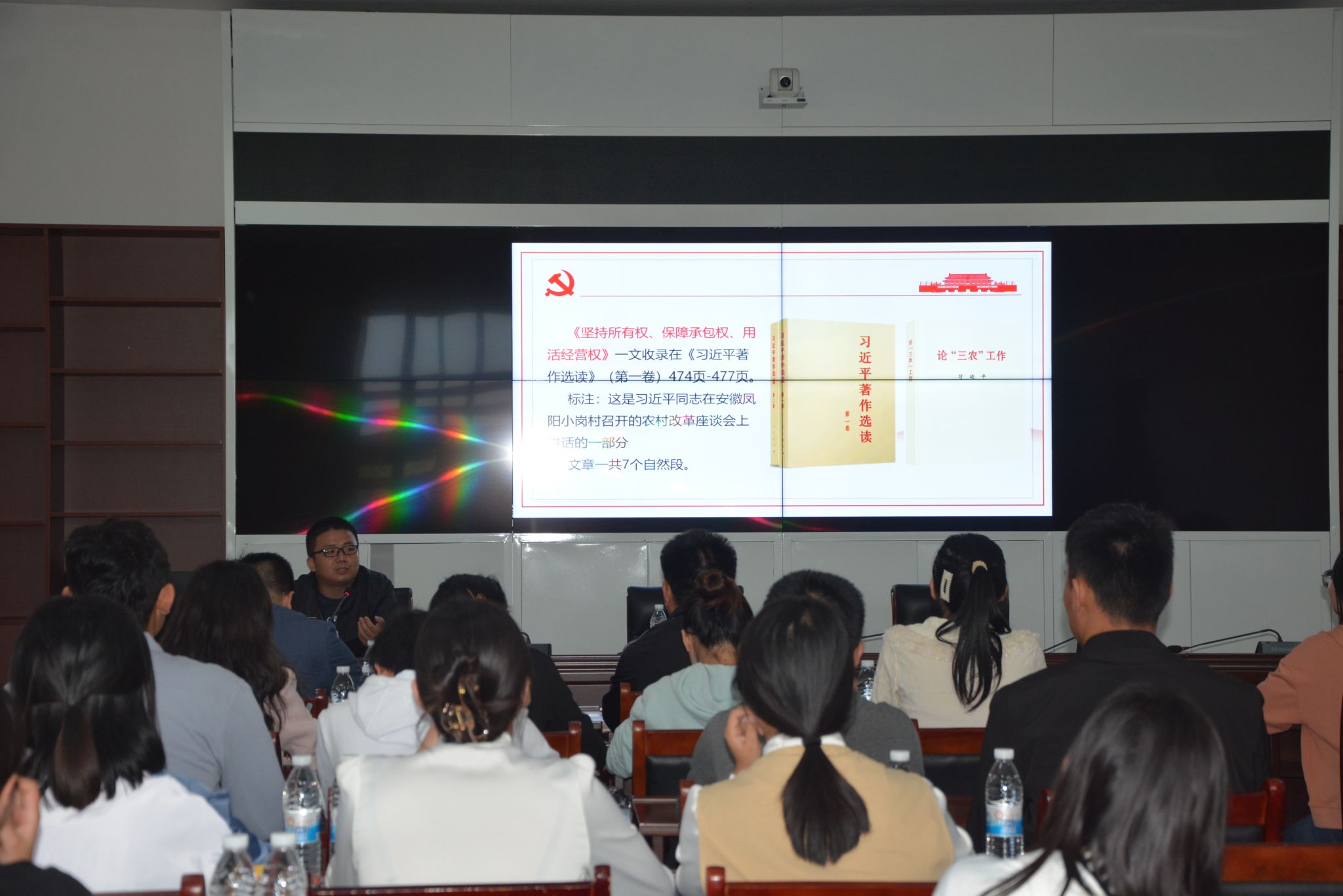 实地参观后,公司师生来到小岗村游客中心会议室召开交流研讨会。公司教师陈道发博士进行了现场思政课教学。陈道发博士结合小岗村改革实际,从改革的主线、改革的目的、改革的策略、改革的重点、改革的底线、改革的路径六个方面深入解读了习近平总书记在农村改革座谈会上的重要讲话,加深了同学们对解决“三农”问题,实施乡村振兴战略重要性的认识,使同学们的责任感和使命感进一步增强。同学们分为五组进行交流研讨,并推选出代表进行总结,各组代表就小岗村蜕变的成功经验、如何传承小岗精神等进行了深刻发言,领学老师对各组发言进行了点评。陈道发对各组代表的发言给予充分肯定,并指出同学们要从小岗村波澜壮阔的发展历史中汲取红色力量,在今后的学习和工作中要敢为人先,不断奋斗。