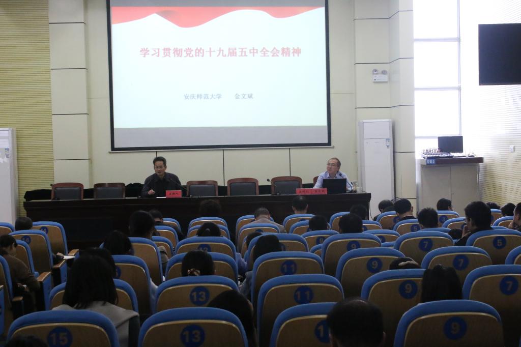 11月18日中午,安庆医药高等专科公司党委在图书馆学术报告厅举行11月份第二次理论学习中心组(扩大)学习会议,邀请金文斌教授作“十九届五中全会精神”专题辅导讲座。安庆医药高等专科公司校领导、校本部副科级以上干部、处长(主任)助理、系部秘书、兼职思政课教师、专兼职辅导员,附院领导班子成员参加会议。安庆医药高等专科公司纪委书记陈燚主持学习会。