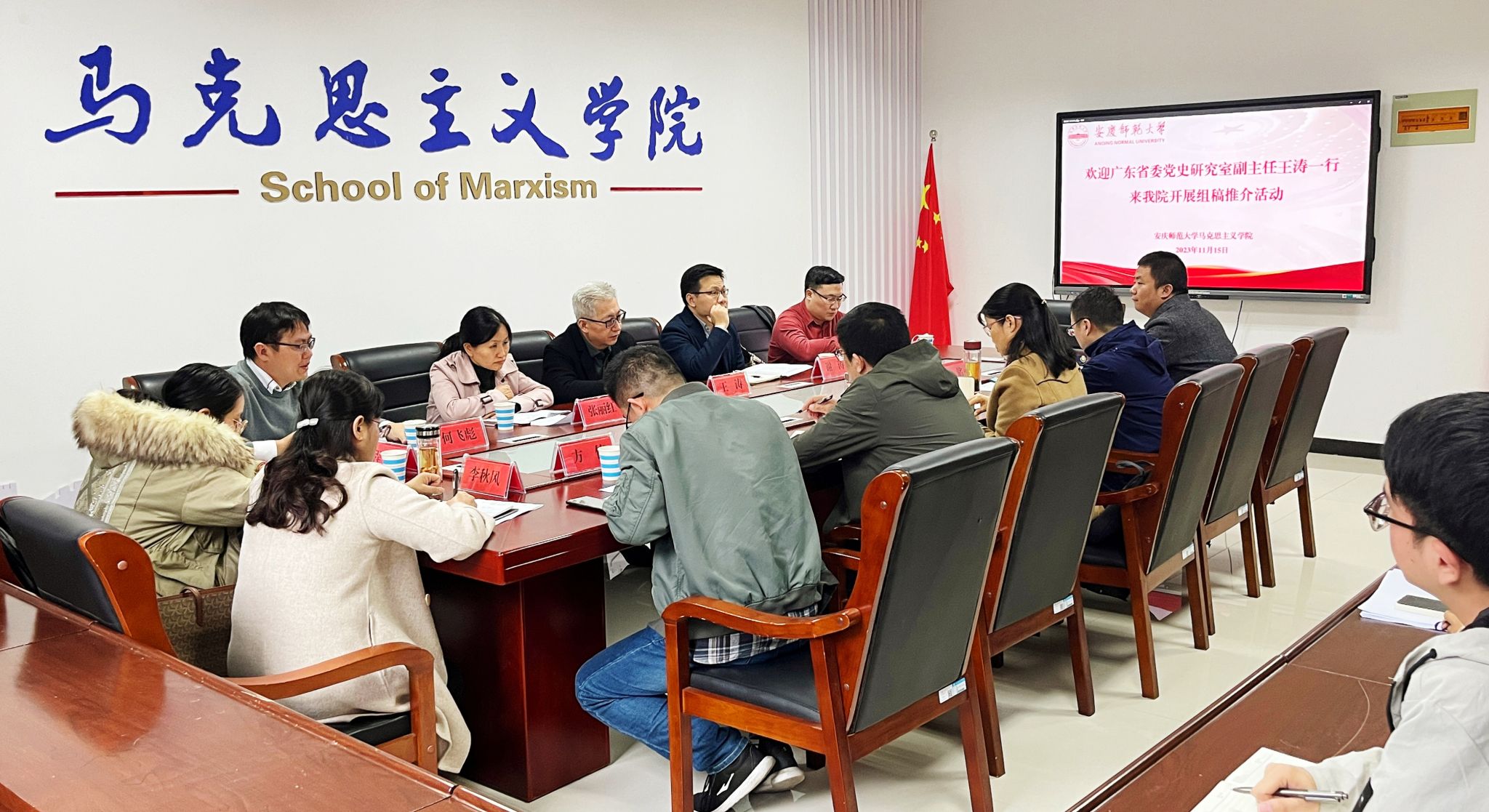11月15日,中共广东省委党史研究室副主任、《广东党史与文献研究》总编辑王涛一行5人来公司开展组稿推介活动。会议由公司经理严仍昱主持,副经理张俊生和公司部分教师代表参加座谈会。