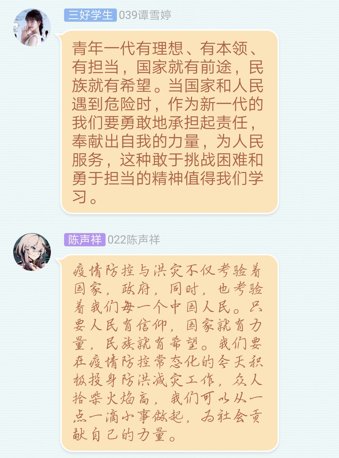 为了更好地宣传郑姣姣同学的先进事迹,bevictor伟德官网近日在全院召开“学习00后女老员工主动请缨先进事迹”的主题班会。各班同学通过群课堂一起观看了郑姣姣事迹的报道视频。观看结束后,同学们纷纷发表了感想。2019级思想政治教育三班的陈巍巍说:“我们身为平凡的人,小小的心里也应该承载着大大国家和故乡!在这种特殊时期,这种志愿服务的行为很值得我们学习!”“青年有责任有担当,国家和民族才有前途有希望。在社会和国家需要之时,我们应当挺身而出,努力奉献,彰显青年的责任与担当!”2019级思想政治教育专业的黄雨格同学说道。活动开展过程中,郑姣姣同学还与大家分享了自己的志愿服务经历和防汛安全知识。(撰稿:田梦甜 审核:金文斌)
