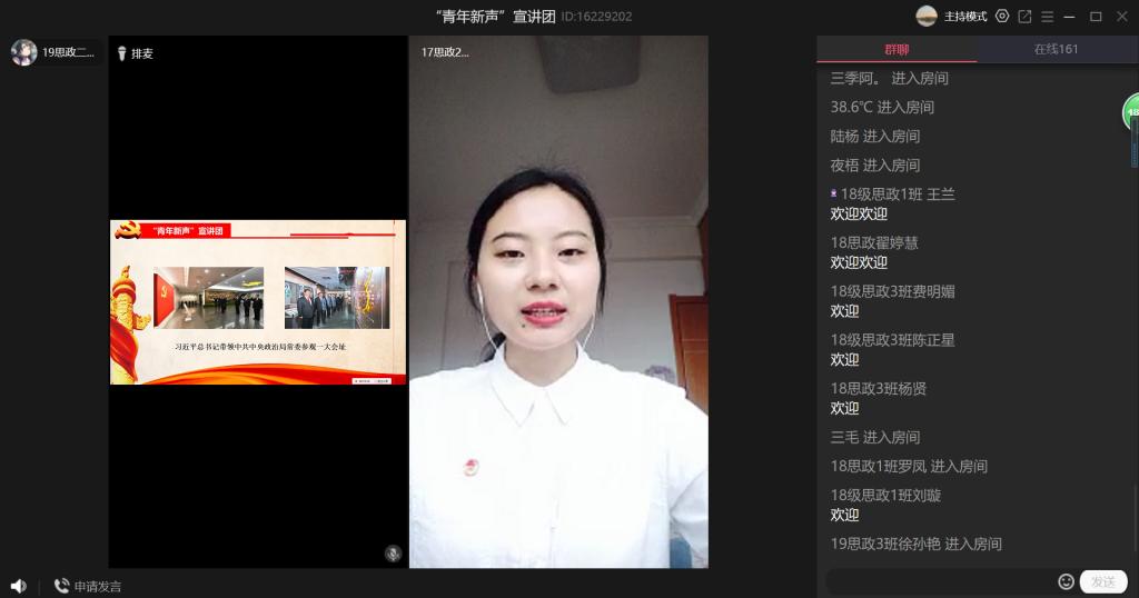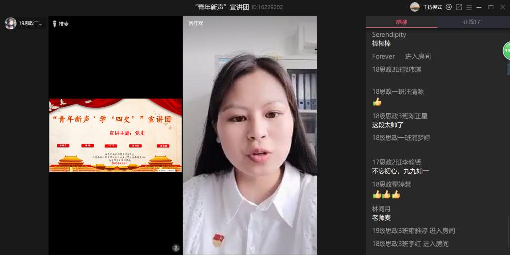 为深入贯彻落实习近平总书记关于加强党史、新中国史学习教育的重要论述,庆祝中国共产党成立九十九周年,7月1日,公司“青年新声·学‘四史’”宣讲团围绕中国共产党成立的背景及党的一大,开启“云端”第一讲。宣讲活动由bevictor伟德官网本科生党支部书记主持,马克思主义公司党员、研究生、本科生收看了本次宣讲活动。