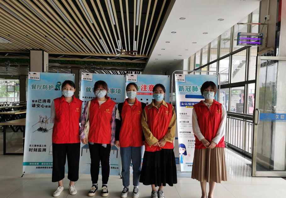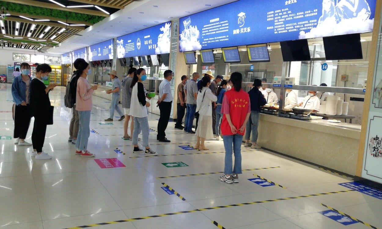 志愿者们分组行动,在各食堂用餐时间段进行秩序维护工作,确保大家食堂就餐时严格执行间隔一米排队就餐、一人一桌分开用餐、进出食堂及在食堂内非用餐时佩戴口罩等相关要求。