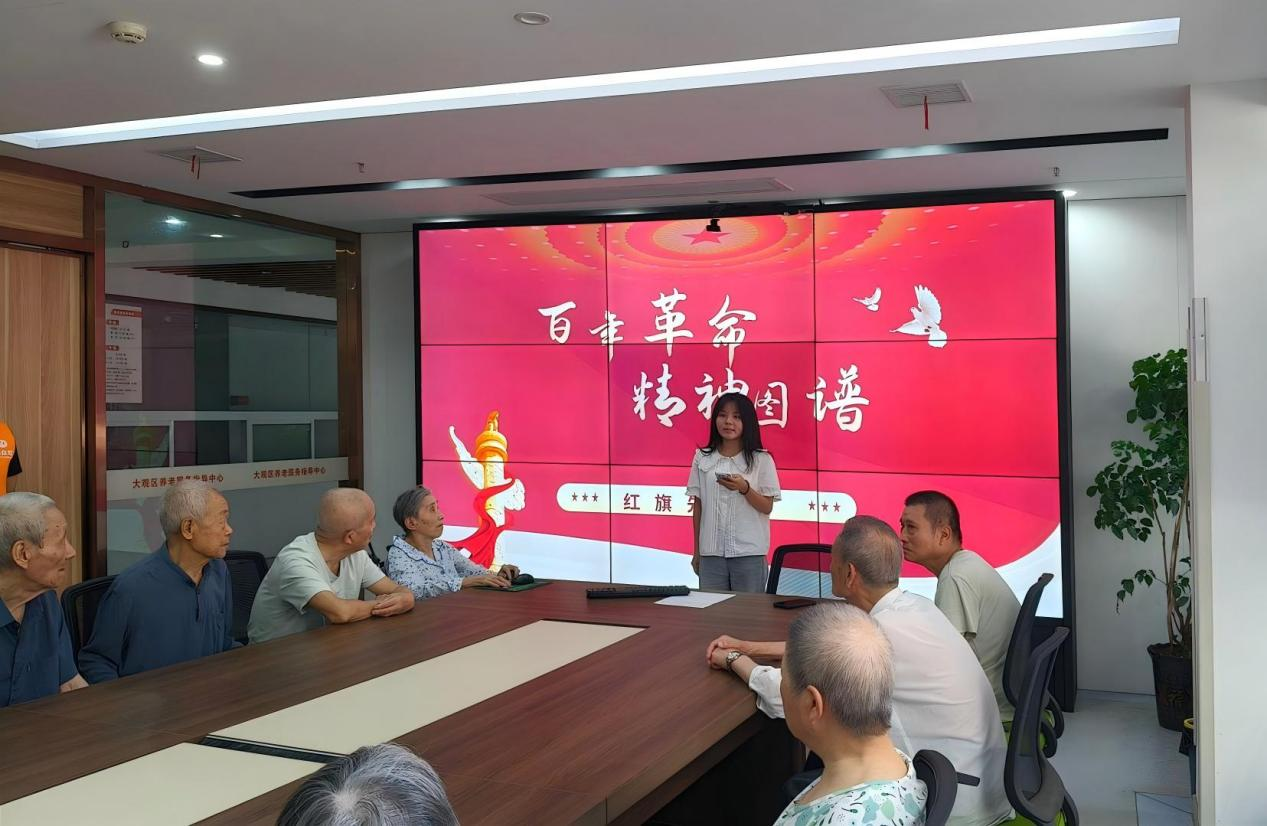 为扩大红色文化影响力,实践团走进安庆市万众和养老院举办“百年革命,精神图谱”主题宣讲会。队员们以“PPT+短视频”的形式,生动讲述了革命英雄的故事。现场还设置了互动环节,邀请老人分享他们的亲身经历,共同合唱爱国歌曲,老人们积极参与,现场气氛热烈。队员孙开玉表示:“我们希望通过这次活动,不仅能给爷爷奶奶们带来欢乐,更能让革命文化在交流中得以传承,让红色精神温暖每一个人的心。”