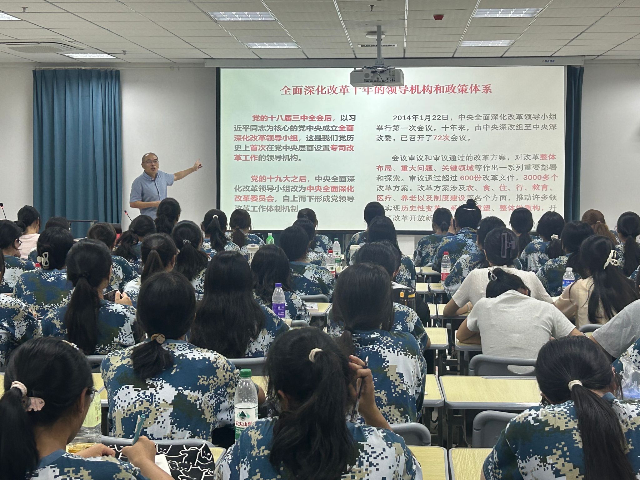 金文斌以《深入学习贯彻党的二十届三中全会精神,为中国式现代化提供强大动力和制度保障》为题,从全会的重大意义、深入学习领会习近平总书记重要讲话精神、全面准确理解《决定》提出的进一步全面深化改革重大举措、全力以赴抓好全会精神贯彻落实等方面作了系统宣讲和深入阐释。金文斌强调,党的二十届三中全会对于激励全国各族人民凝心聚力、奋发进取,以中国式现代化全面推进强国建设和民族复兴伟业,具有重大而深远的历史影响。金文斌指出,全体新生要坚定拥护“两个确立”、坚决做到“两个维护”,深入学习领会习近平总书记关于全面深化改革的一系列新思想、新观点、新论断,深刻认识党的二十届三中全会的重要意义,深刻领会和把握新时代以来全面深化改革的成功实践和伟大成就。
