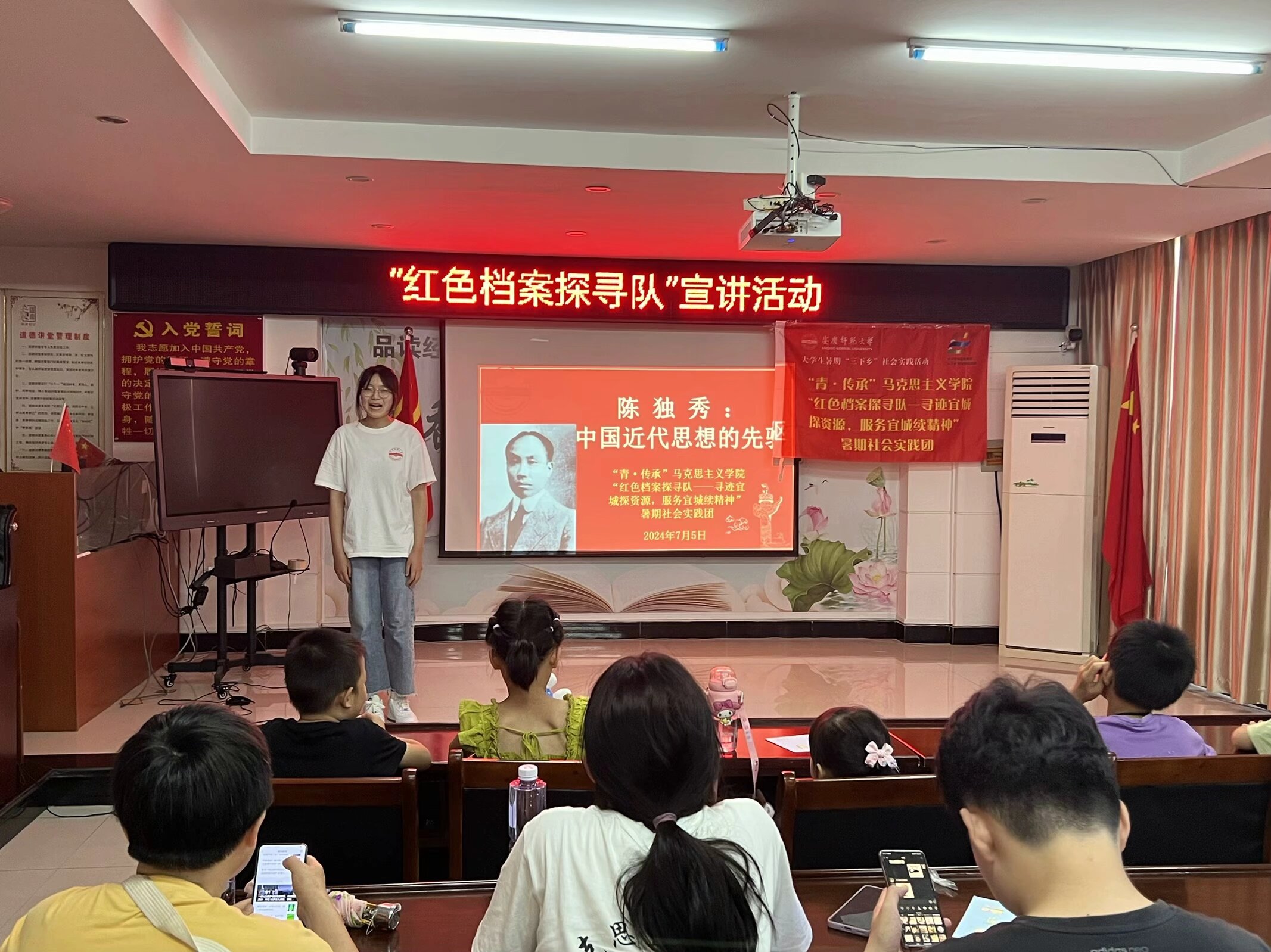 成员们走进燎原社区、华茂社区开展主题宣讲活动,旨在了解民情民意,宣传安庆红色故事,传承红色精神,赓续红色基因。在华茂社区,团队成员们将收集的红色资源进行整理汇编,开展了一场主题为“追寻陈独秀足迹,传承红色基因”的特色宣讲。宣讲成员通过清晰明了的思维导图和图文并茂的资料展示,让观众们重温那段波澜壮阔的历史。华茂社区主任朱凤梅表示:“主讲人宣讲形式新颖、活泼,与观众进行互动式宣讲更让大家印象深刻,希望今后可以更多开展合作。”