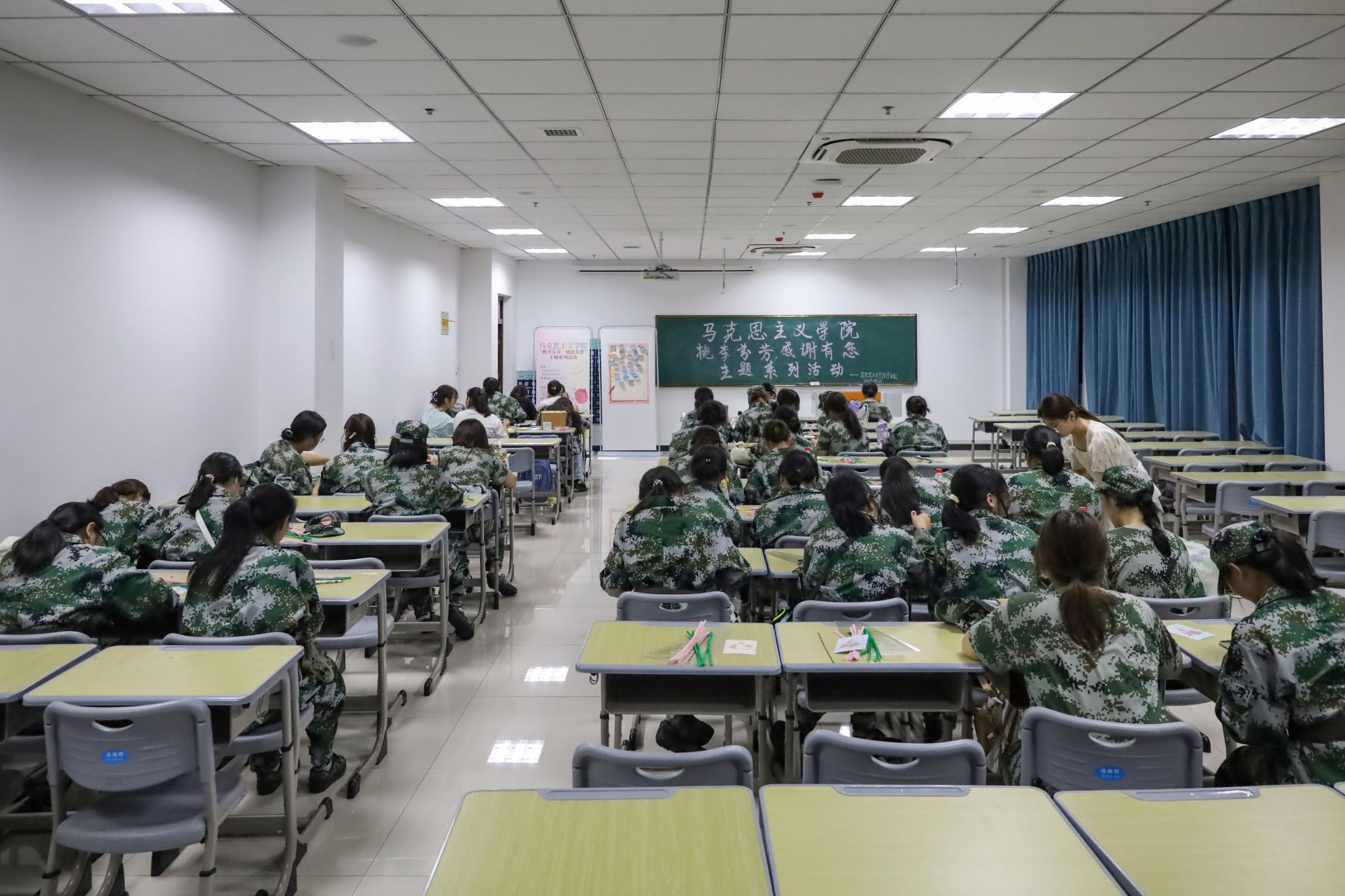 在工作人员的指导下,一束束手工花从员工们手中“绽放”,他们将寄语写在贺卡里,拿出手机拍照留念。不少新生参与到活动中来,思想政治教育专业2023级(3)班的史旭霞便是其中一员。因平时较少接触手工,在制作花瓣的时候,许多难以处理的细节让她“停滞不前”。“但‘小老师’十分细致、有耐心,希望这样有趣且富有意义的活动能在校园里继续开展下去!”