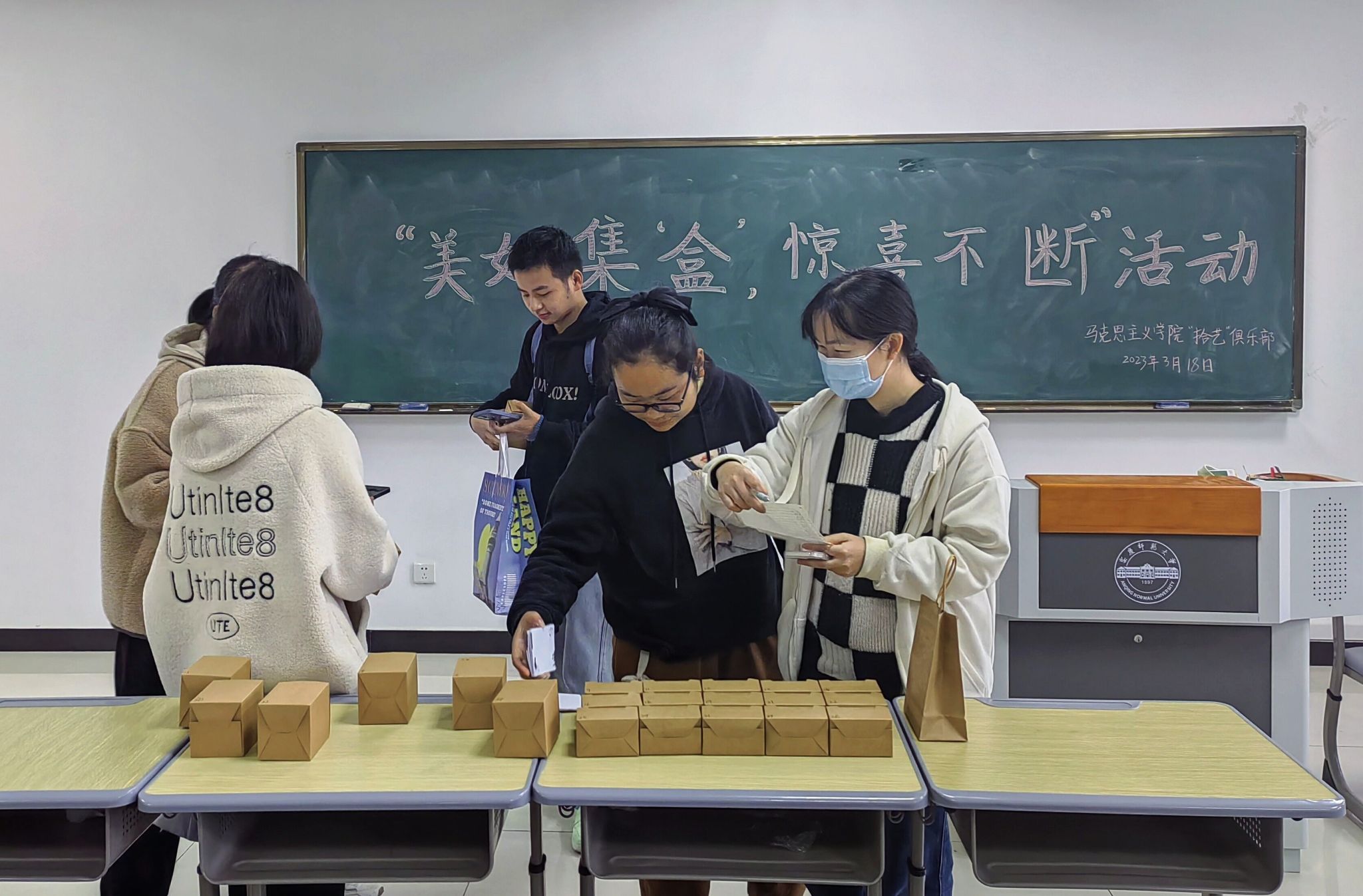 本次活动,“拾艺”俱乐部通过官方QQ进行宣传,定时发布动态,并开展转发集赞换取小礼品活动,提高活动传播的广度与热度。许多同学踊跃参与活动,制作手工礼品,为最后的交换环节做好准备。“拾艺”俱乐部成员细心筛选符合活动要求的礼品,并将其包装整齐。谈及这一环节,俱乐部成员徐海说:“我们在收取盲盒时,要求必须是手工作品,才能够作为盲盒参与最后的交换环节。为了保证最后交换盲盒时大家都能够收获心仪的礼物,在收取礼物的环节我们进行了细致的把关。”