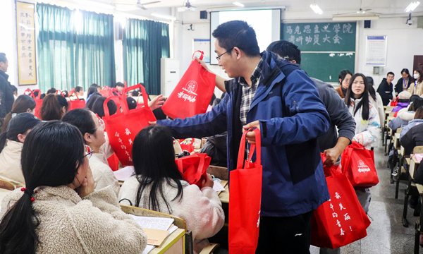 当印有“奋斗的青春最美丽”的福袋被搬进班级,员工们发出阵阵惊叹,福袋里装着一个保温杯、一封爱心信和一个文具袋。思想政治教育专业2018(3)班的江澜收到福袋后直呼惊喜,“这份礼物太贴心了,最让我感动的是爱心信,考研时间逐渐逼近,看到学弟学妹们的暖心祝福我感到放松了许多。”她介绍自己曾为考研学子和新生们写过爱心信,如今自己也收到了学弟学妹的来信,爱心信是公司的一个传统,温暖了一代代马院员工。