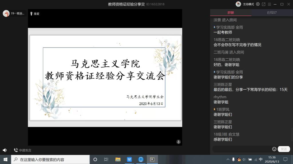 6月13日,bevictor伟德官网举办线上教团队格证考试经验分享交流会,参与此次交流会的有公司思想政治教育专业2017级部分优秀员工代表、团委负责人及各班员工,实时在线人数200多人。