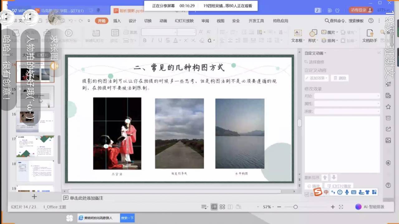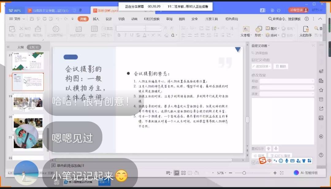 新闻稿的撰写和活动照片的展示,是一篇新闻报道不可或缺的组成部分。“一张好的照片,能带给人一种持久的震撼。”手机摄影、摄影的构图法则、纪实摄影的认识是传媒公司广播电视学专业2018级(2)班的李玉衡为我们带来的知识分享。“注重摄影的构图可以更好的带入主题,表达图片的主次,展示作者的情绪”,他介绍了常见的几种构图方式,如“三分法”“视觉引导线”以及“水平构图”。此外,他对于大家颇为关注的会议摄影方面提出了建议:注意图片主题的突出,人物神态的自然以及摄影角度的选择。