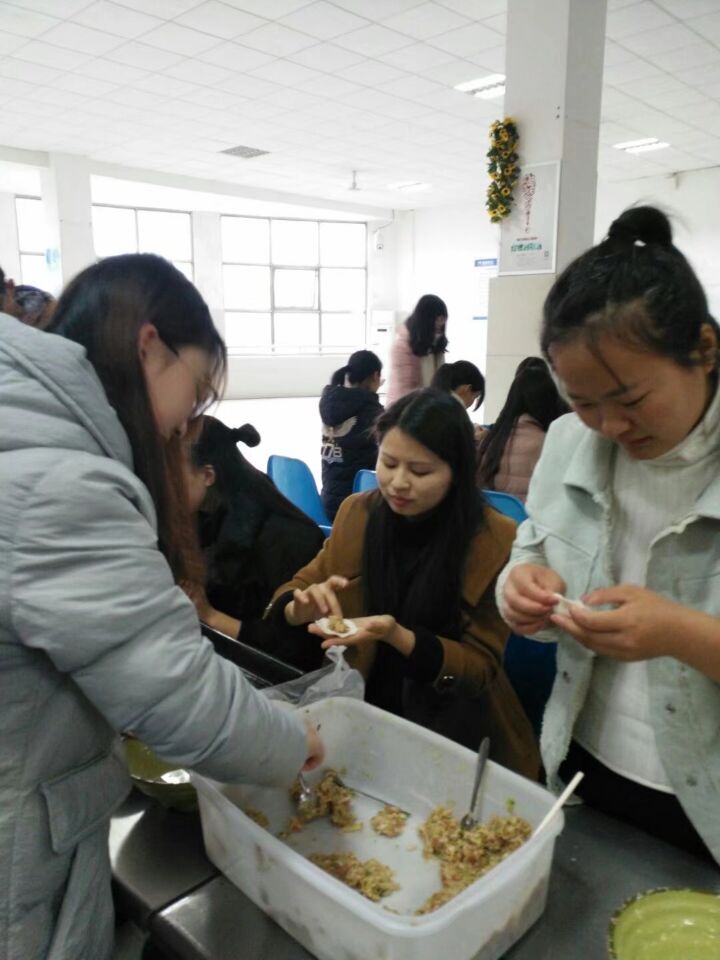 活动现场,七十余名员工分成七组,每组配备至少一名会包饺子的同学进行指导。饺子馅、饺子皮、盘子、勺子、盛水的碗……同学们准备得精心又细致。活动分两阶段进行,第一阶段比包饺子速度、花样;第二阶段比吃饺子、真心话游戏。小小的餐厅里,同学们忙的热火朝天、不亦乐乎。女同学心灵手巧,包出的饺子精美别致;男同学也不示弱,不满足于传统饺子的形状,他们试着玩起各种新造型,形式各异的饺子渐渐腾空而出。当一盘盘热腾腾的饺子新鲜出锅时,大家拿着碗与勺,争先恐后地品尝自己亲手包的饺子。餐厅里笑语连连、热闹非凡。