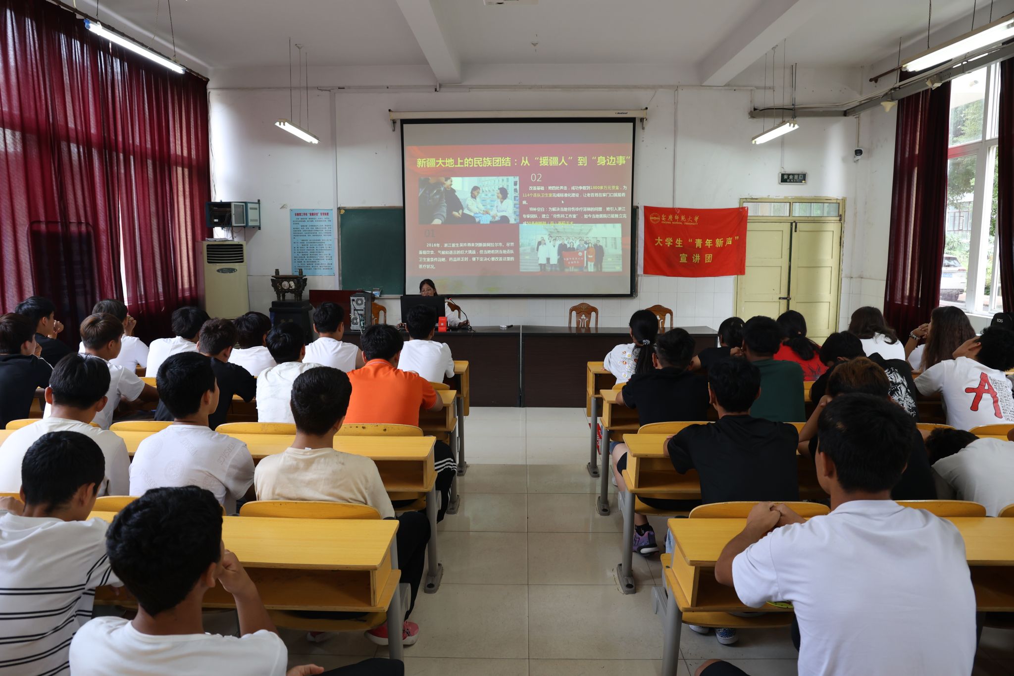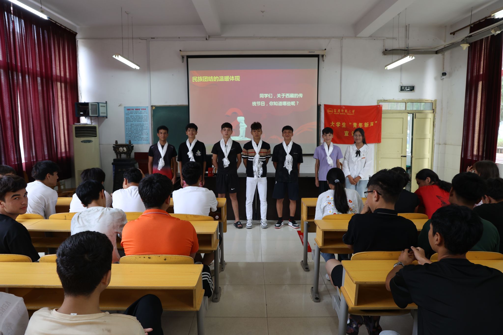 宣讲活动在热烈的氛围中展开,宣讲团成员、思想政治教育专业2024级(2)班强巴卓嘎、郑洁怡以“赓续抗战精神血脉,凝聚民族团结力量”主题,围绕“伟大抗战精神:以热血铸就的爱国底色”“民族团结:以同心汇聚的复兴伟力”“精神传承:做新时代的奋进好青年”三个方面进行宣讲。宣讲人员指出,伟大抗战精神是爱国情怀、民族气节、英雄气概与必胜信念的统一体。同时结合生动的案例强调民族团结是助推民族不断前行的“助燃剂”,宣讲人员鼓励大家要铸牢中华民族共同体意识,为实现中华民族伟大复兴凝聚强大的精神动力。最后,宣讲团成员勉励全体新疆学子要大力弘扬伟大抗战精神和爱国主义精神,厚植爱国情怀,以青春之名,续写伟大抗战精神的辉煌篇章,以实际行动浇灌民族团结之花。